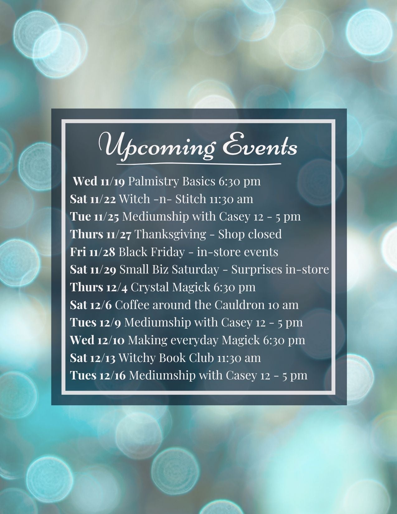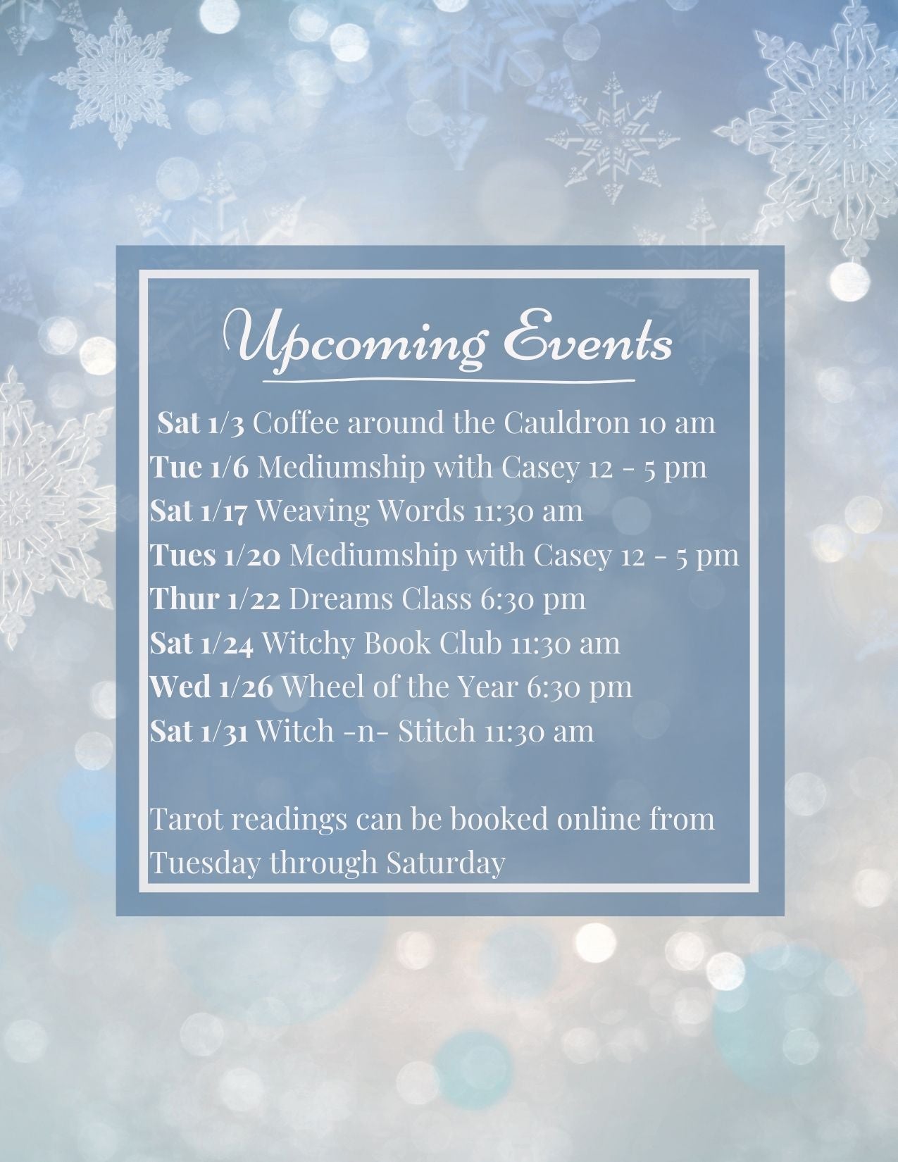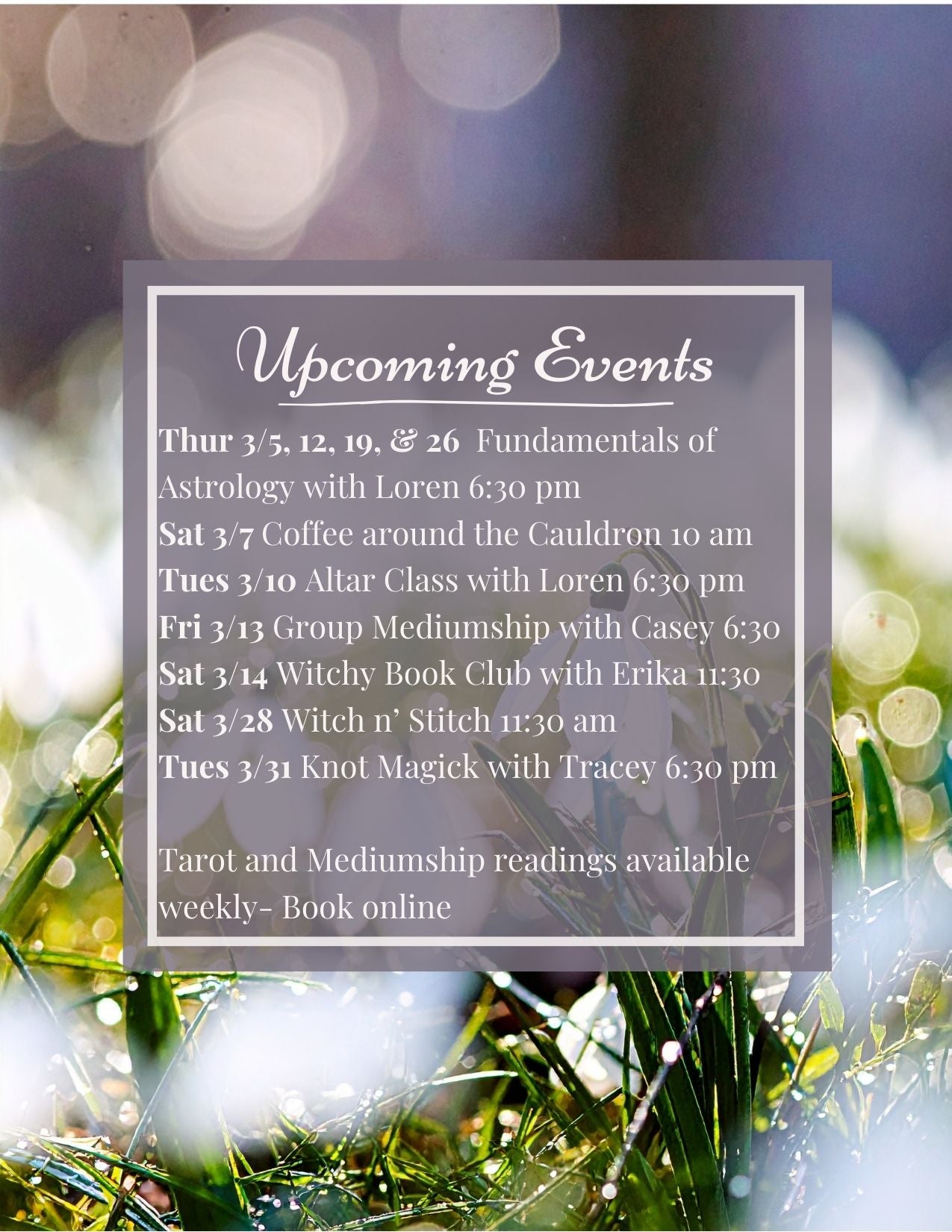 Join us each month for hands-on classes and workshops in our shop. Topics include divination, mediumship, energy work, spell crafting, and so much more. We also offer gatherings so that you can meet other open-minded individuals in a safe, inclusive space.